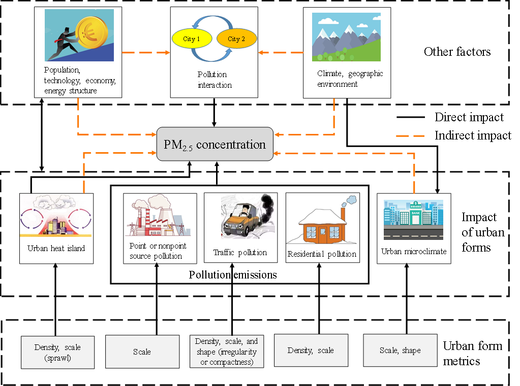 在过去几十年中,工业化和城市化已经成为影响全球发展趋势的强大驱动力。随着城市不断扩和人口增长,环境污染(尤其是PM2.5浓度超标)已经成为一个不容忽视的重要问题。事实上,环境污染问题尤其是PM2.5浓度超标的出现离不开城市的影响,其解决也必须以城市为主要空间尺度。在城市诸多因素与特征中,城市空间形态对城市运行与城市各要素具有一定的锁定效应,成为影响PM2.5浓度的一个重要因素。传统的研究往往结合统计数据和中/高分辨率遥感影像探讨城市空间形态与PM2.5浓度的相关性,无法做到尺度长时序的测度与量化。在进行关系量化研究的同时,往往从单一视角如个别年份的单一类型城市)进行分析,忽略了PM2.5浓度与城市空间形态关系对城市类型差异的敏感性。