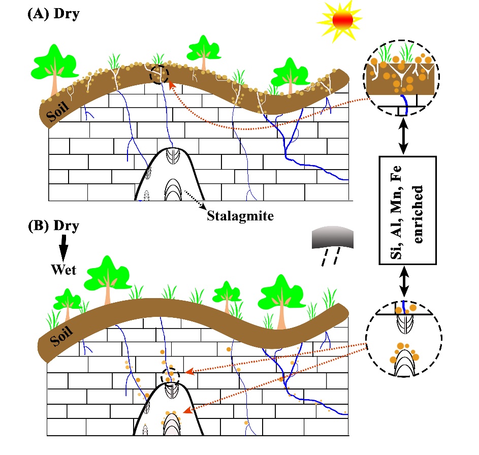 图4 不同水文条件下Si、Al、Mn、Fe在土壤和基岩裂隙中的运移示意图。棕色条带代表土壤层,土壤层中的白色线条代表土壤层裂隙,大小不一的亮棕色圆点代表富含Si, Al, Mn, Fe等元素的较细的土壤颗粒,蓝色线条代表基岩中的裂隙。(A) 干旱的环境中,土壤微粒分布在土壤层。(B) 当亚洲夏季风开始增强时,区域水文环境由干旱向湿润转变,地表植被开始恢复,降水增加,岩土裂隙中的水动力增强。富集在土壤和裂隙中的颗粒/胶体被裂隙水冲刷并带入洞穴,被石笋保存。此时,石笋中Si、Al、Mn、Fe等元素含量脉冲式增加。