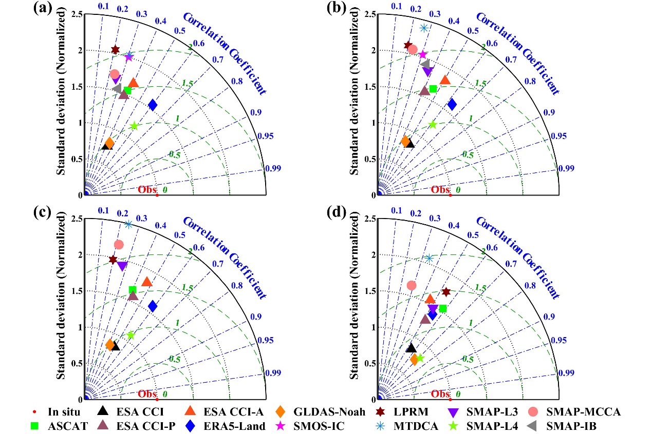 图2. 2015-2018年近地表土壤水分产品验证指标中值,图 (a)-(d) 分别展示了基于四种验证策略的泰勒图