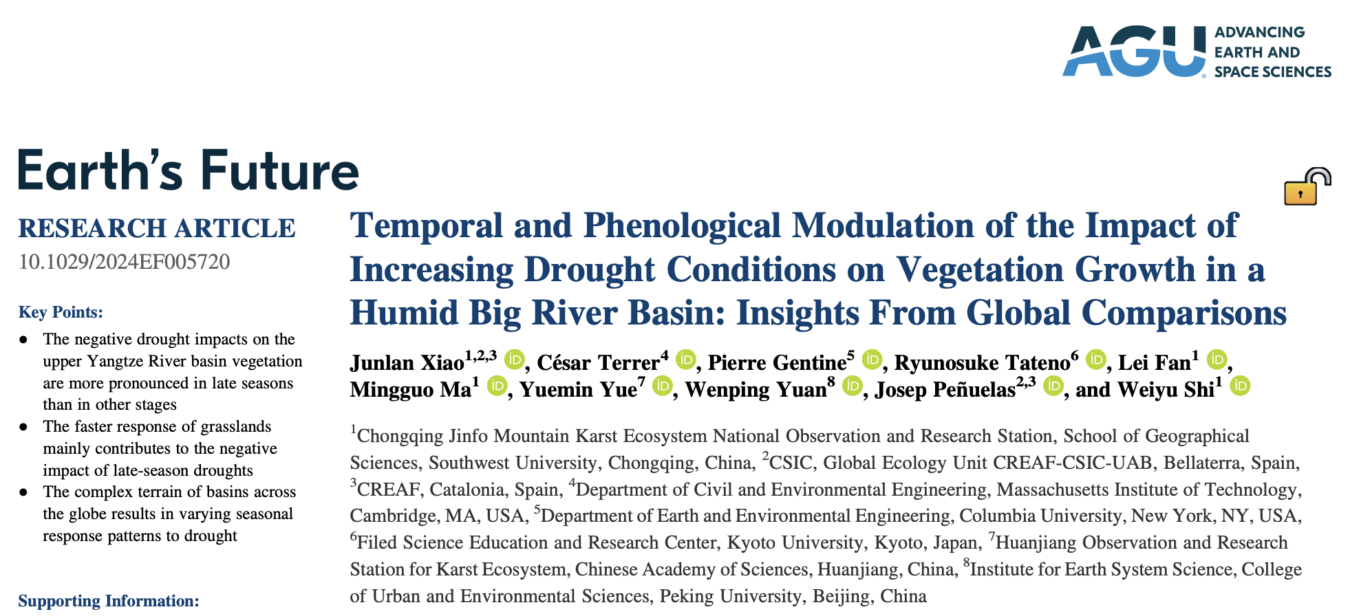 近日,学院时伟宇教授团队在《地球未来》(Earth’s Future)期刊发表了题为《湿润大河流域中日益加剧的干旱对植被生长影响的时序与物候调控:来自全球对比的启示》( Temporal and Phenological Modulation of the Impact of Increasing Drought Conditions on Vegetation Growth in a Humid Big River Basin: Insights From Global Comparisons)的研究论文。