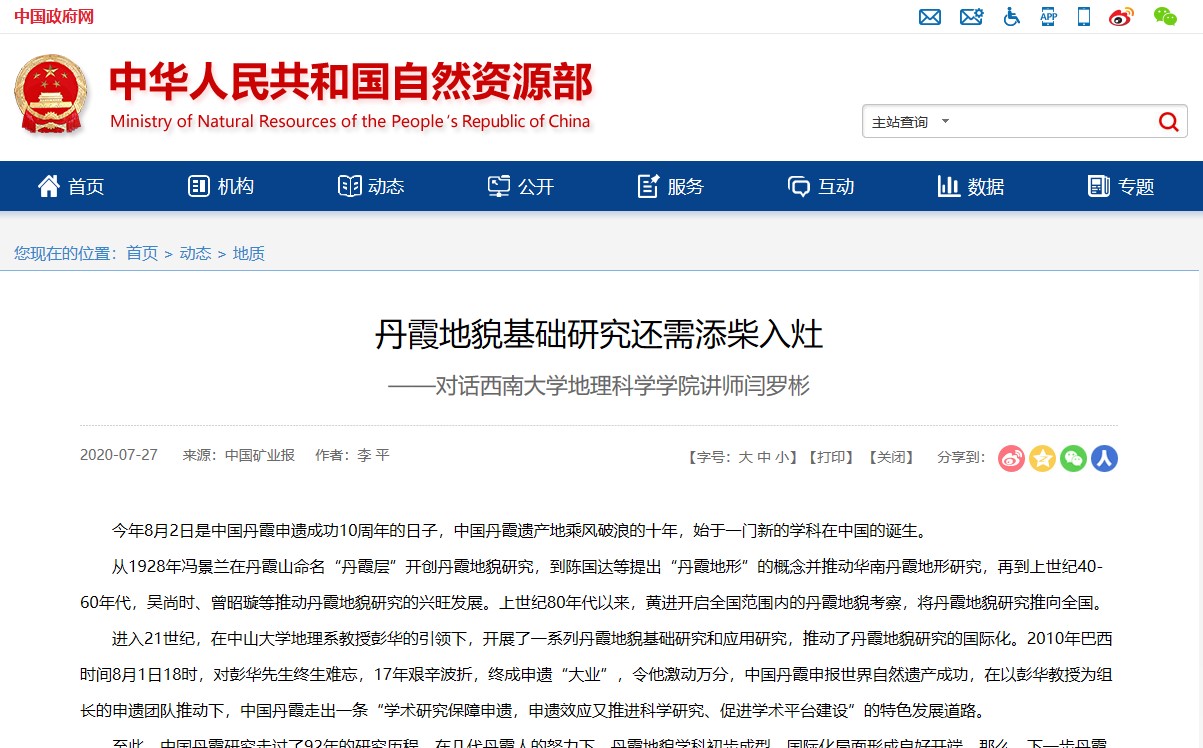 近日,哔咔漫画 青年教师闫罗彬接受媒体《中国矿业报》记者李平专访,作为丹霞地貌领域较有影响力的学者,闫罗彬就丹霞地貌学科发展历程、学科前景、丹霞地貌地学价值和科普工作以及基础研究现状等方面做了介绍和展望。该专访以《丹霞地貌基础研究还需添柴入灶——对话哔咔漫画 讲师闫罗彬》为题,于7月26日在《中国矿业报》和新华网客户端发表,一经上线即获得广泛关注,在新华网首日浏览量超过100万,获得良好社会评价。昨日该专访被自然资源部官网转载(//www.mnr.gov.cn/dt/dzdc/202007/t20200727_2534555.html)。