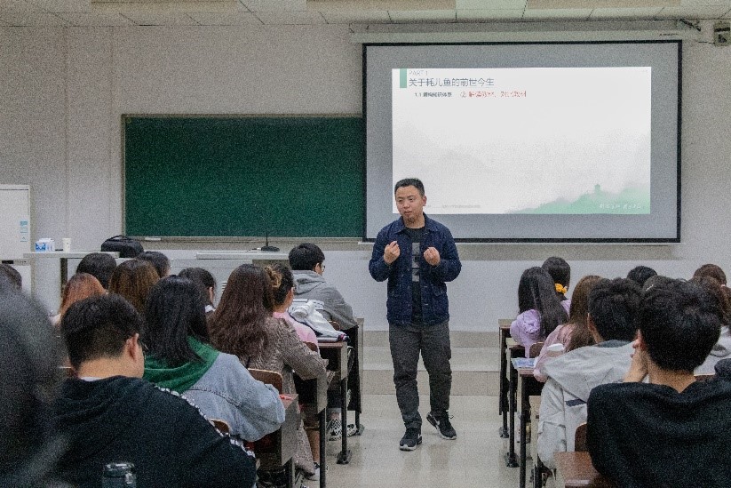 随后,缪羽老师以如何制作有吸引力的地理科普视频为例,讲到地理科普视频的制作需要有趣味性、结合时事、与生活相关,并且能引起观众共鸣。据此,缪羽老师将地理科普视频的制作思路运用到地理教学上,提出了“有意思比有意义更重要”的观点。 分享会中缪羽老师以自己的一堂主题为“走近耗儿鱼”的关于“海水的温度与盐度”的省级优质课为例,生动形象地介绍了自己完整的优质课设计思路及方法。缪羽老师讲到:“如果课堂是一辆车,老师是驾驶员,学生则是乘客,那么情景的载体便是车的底盘,知识体系如同发动机,内容素材是装饰,行课线索是框架”。而在介绍完“走近耗儿鱼”这一场优质课经历之后,缪羽老师又以他其他丰富的优质课经历为例,向同学们讲述了众多实用且有意义的优质课经验与方法。“学习需从模仿开始,进步以积累为重,突破抓关键契机,机会留给有准备的人,没有机会便创造机会”这不仅是缪羽老师对于自身经历的感悟与总结,更是缪羽老师作为一位地理教育的先行者对各位后辈的谆谆教诲!