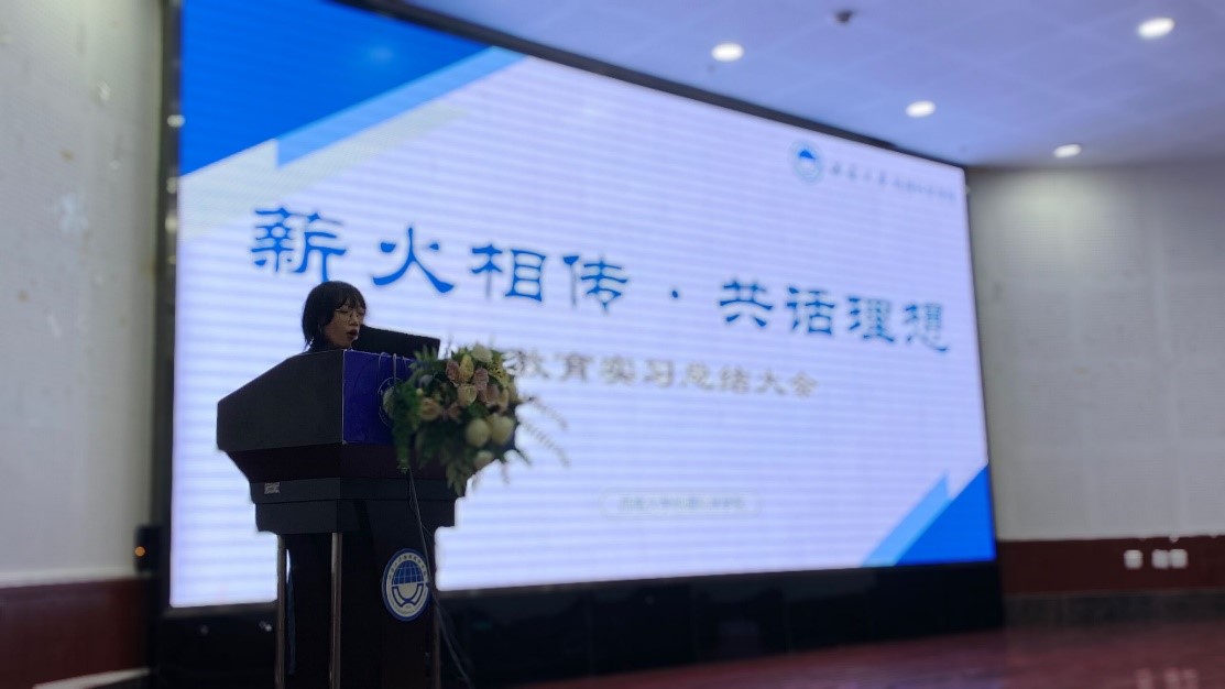 紧接着,优秀实习指导教师苏迎春老师发言。苏老师由当前就业竞争压力较大引入,分享了实习面试时对于不同情况的应对措施。同时,苏老师用以往的学生作为典范,勉励师范生们做好西大地科人的传承,为母校发展尽一份自己的光和热。