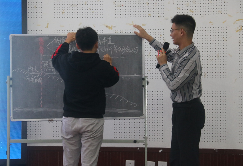 实习总结汇报结束后,2018级实习生代表饶剑彪进行了实习成果演示。他在会场打造了一堂微课,用南海海域与临海关系的例子引出海洋权益的课程主题,引用历史故事解释地理词汇的具体含义,营造了幽默风趣的课堂氛围,赢得了现场同学们的热烈掌声。