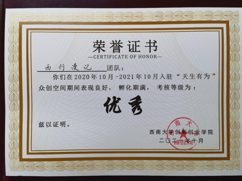 在过去的两年里“西行漫记”项目多次成功开展研学旅行活动,获得研学参与者的好评,并在本次哔咔漫画 “天生有为”众创空间2020年度团队考核中获评“优秀”等级,由审核评委颁发了优秀团队证书和奖金。