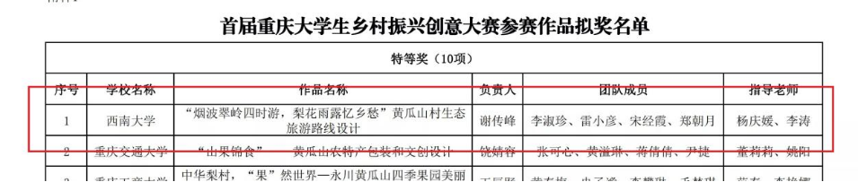 本次大赛中,学院本科生谢传峰等同学制作的作品《‘烟波翠岭四时游,梨花雨露忆乡愁’黄瓜山村生态旅游路线设计》,在杨庆媛老师、李涛老师的指导下,以总分第一的成绩荣获特等奖;马燕等同学的作品《‘相约中华梨村,共赏琳琅四季’黄瓜山村精品旅游路线设计》,在胡蓉老师、陈萍老师的指导下,荣获一等奖。