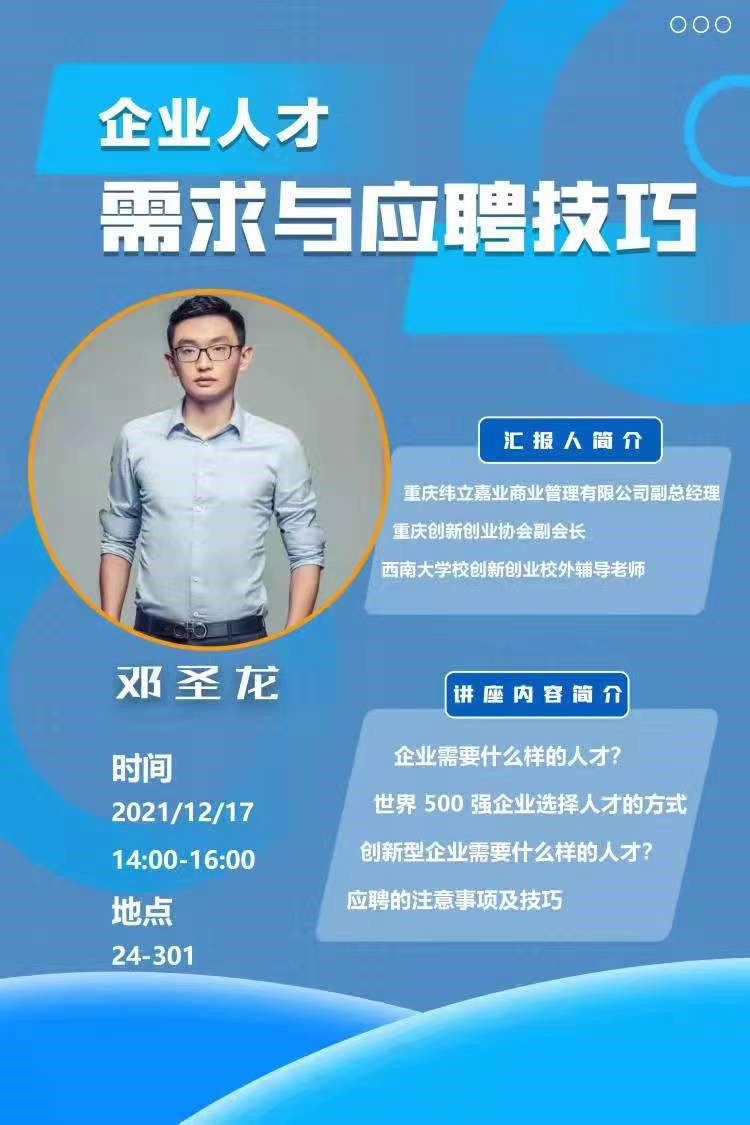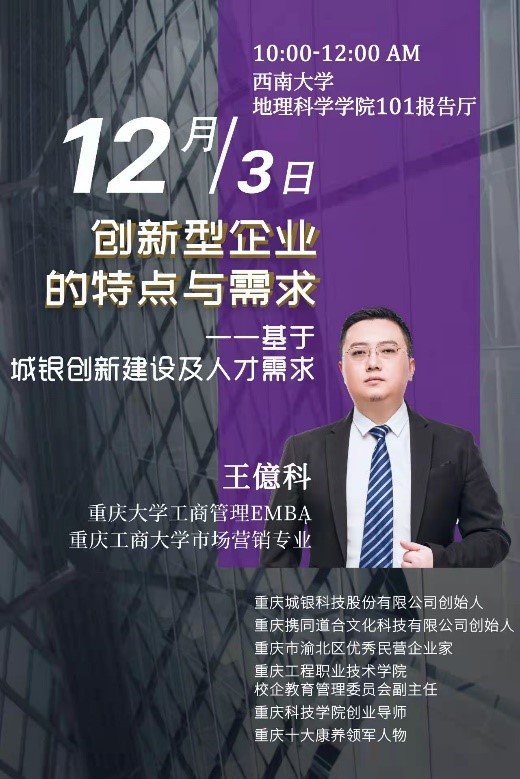 活动采取“学院统筹推进、基地自主申报”的方式,在各基地的申报讲座主题中,学院遴选符合学生创新创业需求、体现企业家民族责任感的主题,共开展4期系列讲座。重庆城银科技股份有限公司创始人王億科就《创新型企业的特点与需求》作报告,指出结合国家“十四五”发展规划,探索学科知识与创新创业的结合点,是国家实现高质量发展的重要渠道;重庆纬立行地产顾问有限公司副总经理陈剑峰作《聊一聊创新思维》报告,从“明确目标,形成画像”“解构过程,找到关键量”“梳理路径,做成计划”“坚决执行,循环优化”四个方面生动的阐述了思维创新的渠道;重庆纬立嘉商业管理有限公司副总经理邓圣龙在《企业人才需求与应聘技巧》的讲座中,利用大数据,对近年来大学生毕业去向进行分析,让同学们深刻了解国家和社会对于创新创业人才的渴求,并从实操层面,从专业技能、价值观、稳定性和性价比四个方面给予同学们应聘建议;重庆市西站投资发展有限公司总经理赵永波,站在有民族责任感企业家的角度,通过阐述中国国家边界的历史变迁,明确了创新创业对于国家发展的重要意义,是实现中华民族伟大复兴的必由之路。