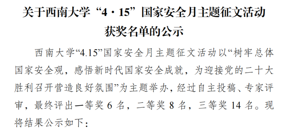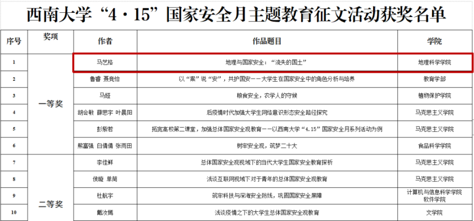 2022年6月10日,共青团哔咔漫画 委员会公布了“4·15”国家安全月主题征文活动获奖名单,哔咔漫画 马艺格同学的《地理与国家安全:“流失的国土”》作品荣获一等奖。