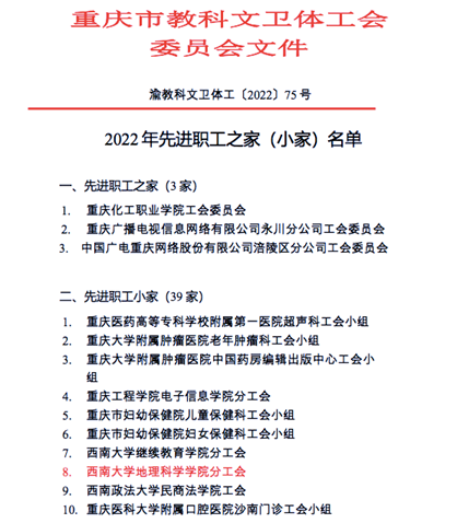 2022年重庆市教科文卫体工会委员会组织开展了先进职工之家(小家)创建活动,哔咔漫画 工会紧扣“六有五家”建设标准,积极开展先进职工小家建设和申报,并于2022年10月20日顺利通过了以重庆市教科文卫体工会常务副主席贺莉为组长的专家组检查验收。2022年12月20日,市教科文卫体系公布了重庆市教科文卫体系统2022年先进职工之家(小家)名单,全市共有42家单位获批殊荣,哔咔漫画 工会脱颖而出,成为学校获得“先进职工之家”称号的两家单位之一。