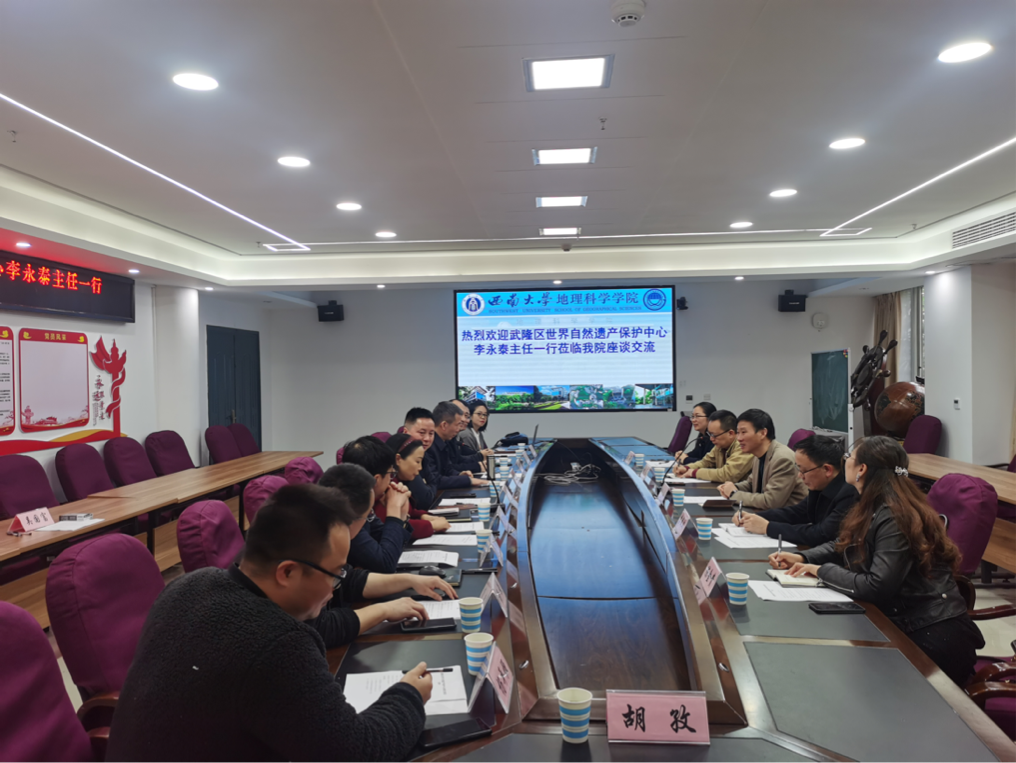 2023年3月9日上午,武隆区世界自然遗产保护中心李永泰主任、李盛波副主任、刘强副主任等5人一行来到哔咔漫画 就院地合作交流座谈,学院党委行政主要负责人、分管负责人、管理干部以及教授代表出席本次座谈会,会议由杨庆媛院长主持。
