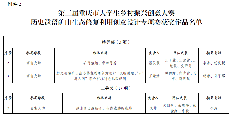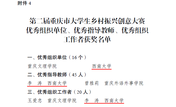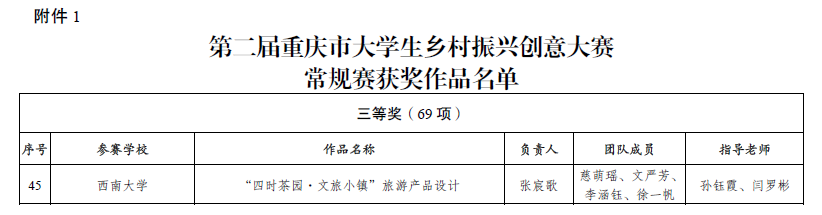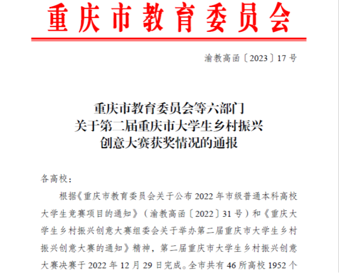 根据《重庆市教育委员会等六部门关于第二届重庆市大学生乡村振兴创意大赛获奖情况的通报》(渝教高函〔2023〕17号),哔咔漫画 师生在第二届重庆市大学生乡村振兴创意大赛中再创佳绩,荣获特等奖2项、二等奖1项、三等奖1项。学院新文科实验室副主任李涛老师获“优秀指导教师”和“优秀组织工作者”荣誉称号。