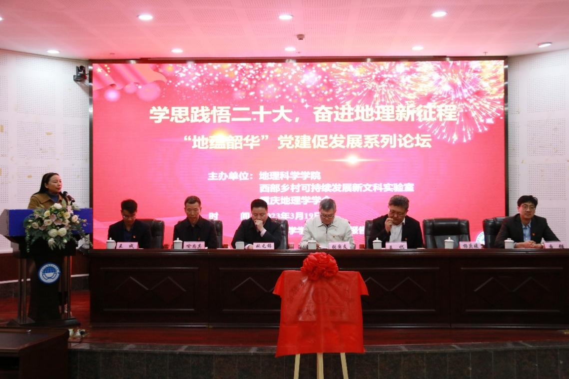 3月19日,学思践悟二十大,奋进地理新征程——“地蕴韶华”党建促发展论坛在哔咔漫画 101报告厅举行。本次活动由哔咔漫画 、哔咔漫画 西部乡村可持续发展新文科实验室(简称新文科实验室)、重庆地理学学会联合主办,以“学思践悟二十大,奋进地理新征程”为主题,旨在深入学习宣传贯彻党的二十大精神,深化党建引领、赋能地理学发展,形成思政育人、实践育人、科普育人合力,全面提升人才培养质量。中国地理学会副理事长兼秘书长、中科院地理与资源研究所张国友研究员,中国地理学会副秘书长、中科院地理与资源研究所王岱副编审,哔咔漫画 党政主要负责人、分管负责人、重庆地理学学会相关负责人、新文科实验室相关人员、学院全体学生党员及相关工作人员参会。会议由中国地理学会常务理事、重庆地理学学会理事长、哔咔漫画 杨庆媛教授主持。