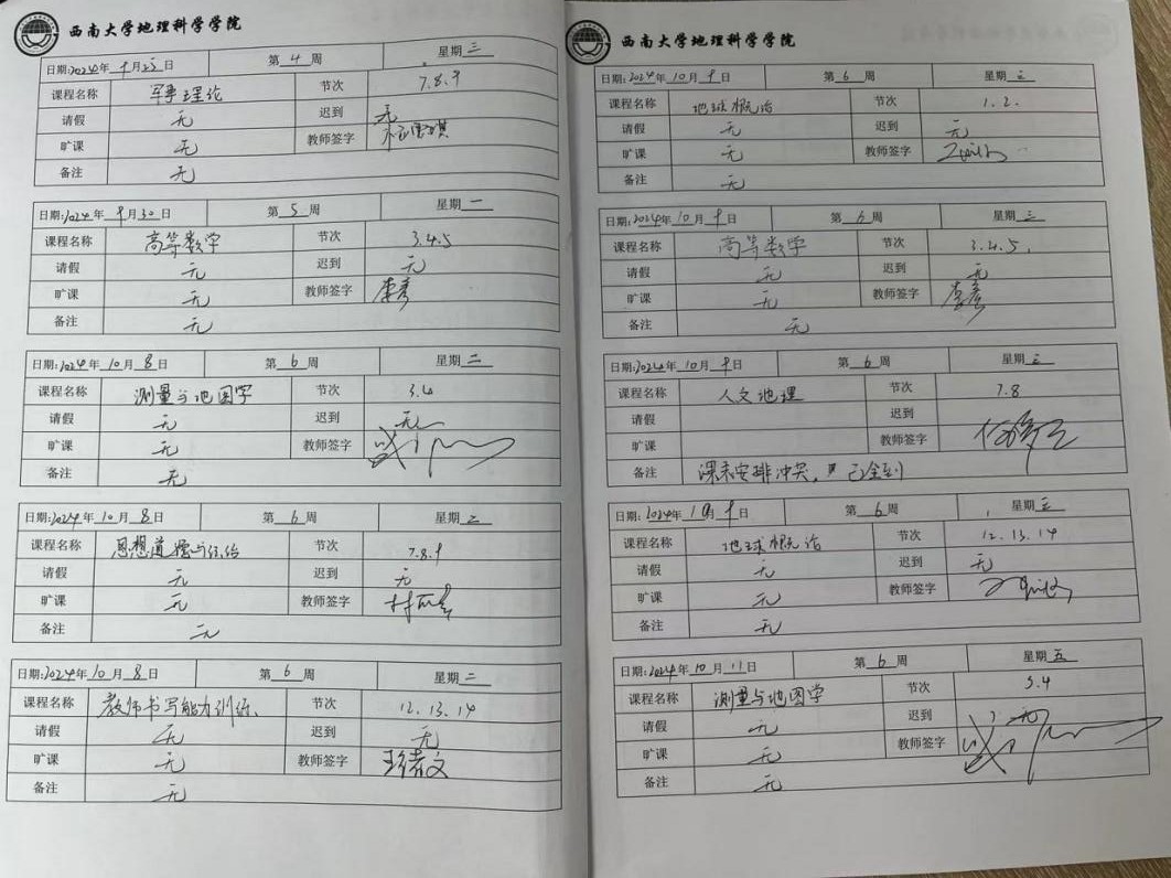 此外,统一规范的课堂考勤管理制度也是学院学风建设的重要内容。各班的组织纪律委员须在任课老师抵达教室后进行现场点名,并在课程结束后请任课老师在纸质考勤表上签字确认。每周结束后,班级考勤情况将由年级助理进行统一统计与整理,并在年级群内公示。所有考勤结果将在期末时统一汇总,并作为各门课程平时成绩的重要参考依据提交至任课老师。