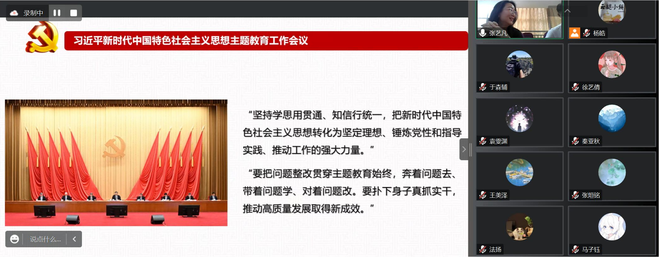 随后,胡乐副书记详细介绍了学习贯彻习近平新时代中国特色社会主义思想主题教育“学思想、强党性、重实践、建新功”的总要求,启发同学们启智启心、刻苦努力,寻找自己的立身之本。她以大学生自我成长为立足点,向同学们分享了党的自我革命的重要意义。此外,结合大学生生活实际,举例了学生党员的榜样与带动作用,强调了大学生党员干部在学风建设与班级建设等领域的重要意义。